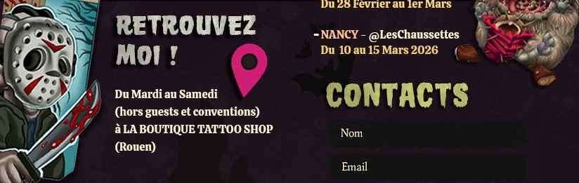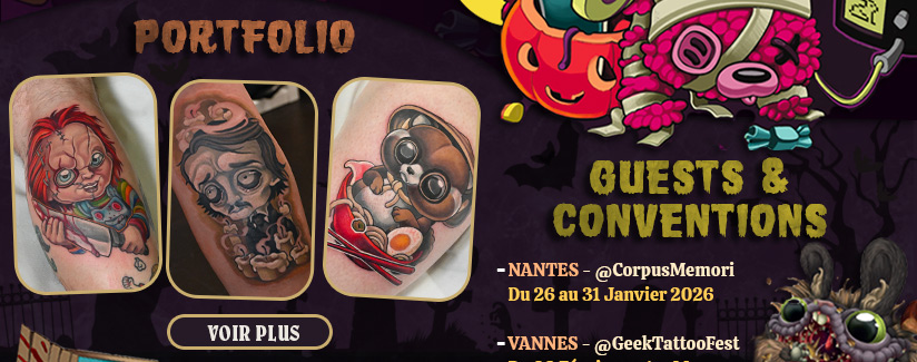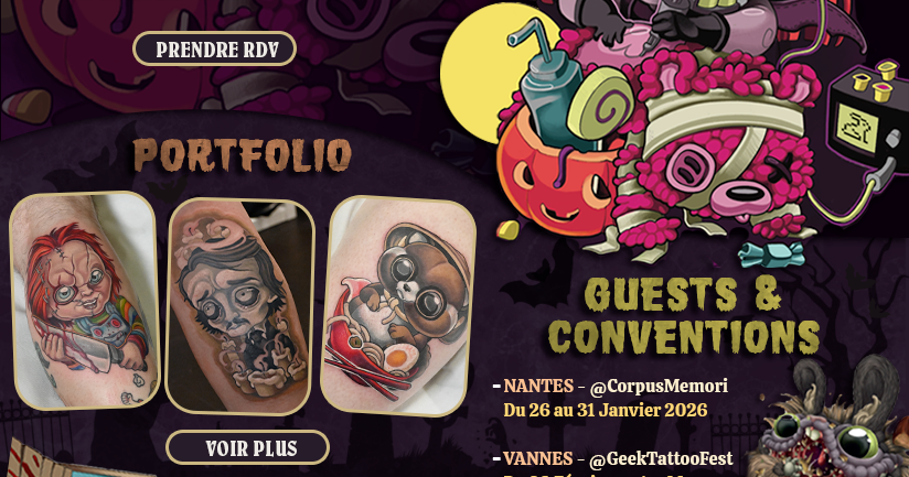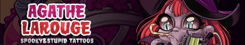 En parallèle de son univers New School et spooky, Agathe Larouge réalise également des tatouages sur mesure : projets minimalistes, noir et gris, lettrage, cover et créations personnalisées.